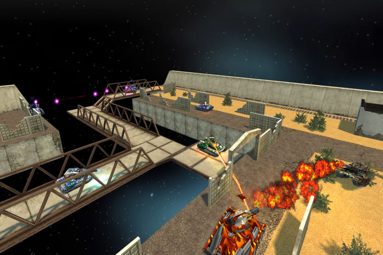 - 在第一个版本的地图中,没有连接两个基地的路桥大战,因此没有控制点和互夺军旗模式,玩这个是没有意义的。冰风暴或火焰炮这使得地图成为一个独特的«射程»,适合长射程炮塔。后来添加了路桥大战和缺失模式。