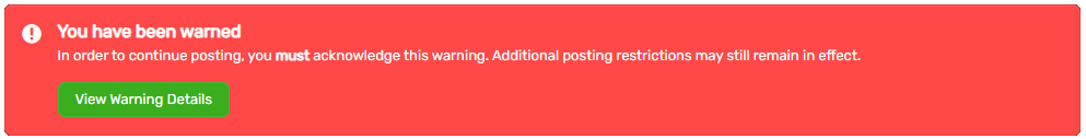 收到论坛警告/禁令的用户在进入网站时会收到通知,告知他们违规和处罚的详细信息。您必须确认警告;否则,您将无法在论坛上发布任何内容。
