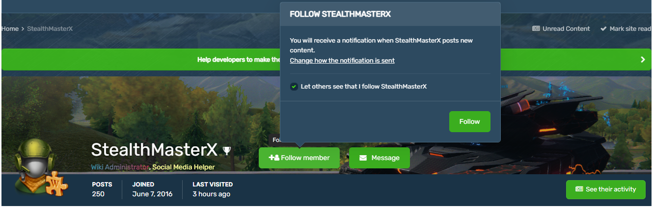 关注任何用户后,您将收到关于论坛活动的通知:他们在主题中的帖子、对帖子的反应等。