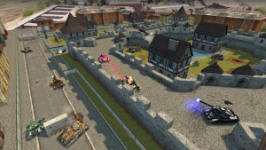 科隆控制点 has three 控制点. Points B and C are located in the 团队’s 旗子 areas, while point A is located right in the centre of the 地图, within the walls of the castle. At the beginning of the 战斗, points B and C will go one to each 团队, leaving point A to be heavily contested. The tactics for close quarters combat, as previously mentioned under 死亡混战/团队对战 will apply here for the 战斗 to capture point A. Short 射程炮塔 are almost essential, along with medium or heavy 底盘 to aid survivability. 道具 are highly useful in these circumstances, and a couple of motivated 磁力炮 can often be the difference between winning and losing.