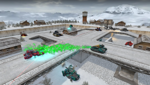 Due to the interesting 职务 of certain walls, houses, et cetera; a wide 射程 of equipment can be suitable here. Let us take a look at 底盘 - this 地图 is a moderately sized, so a light or a medium 底盘 such as 蜂王 or 维京 is suitable here as their maneuverability can come in handy when dodging 红队 or defending themselves using the walls and houses present in the 地图. At the same time, heavy 底盘 like 泰坦 can also be used here if you are looking into positioning yourself in one area and dominating. There are a wide number of 炮塔 that could be effectively used in 十字路口 - and the most suitable 炮塔 would be 火龙珠, 轰天炮, 激光炮 and 火箭炮. Around the periphery of the 地图, the area is empty and so long 射程炮塔 like 激光炮/轰天炮 would be really effective and at the same time, in the central area, due to houses and walls being present. It is really efficient for a 炮塔 like 火龙珠/雷暴炮/火箭炮 due to its 溅射伤害/ricocheting effect which would dominate. An ideal type of equipment generally suitable for all playing styles would be 轰天炮 and 维京.