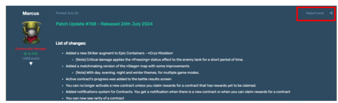 与游戏内系统不同,报告机制在论坛工作方式不同。在论坛上,公共和私人信息都可以被举报。要做到这一点,请按下«报告 post»右上角的按钮。点击这个按钮会打开一个表单,您可以在其中提供有关报告的进一步信息。如果报告的原因不立即明显,这一点尤其重要。在收到报告后,论坛管理员将处理此信息并做出决定:如果消息确实违反了规则,将被删除,作者将受到惩罚。
