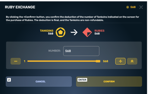 一个用于交换坦克币到红宝石的独立窗口出现在大厅当点击红宝石余额时。