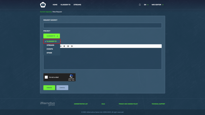 3) 在“请求主题”字段中输入您的问题。从“项目”列表中选择 «Vlogger TO» 选项以表示您的问题与 YouTuber TO 计划有关。在“描述问题”中描述您在宇宙中遇到的问题。完成后,完成验证码并点击 «创建» 按钮提交您的查询。